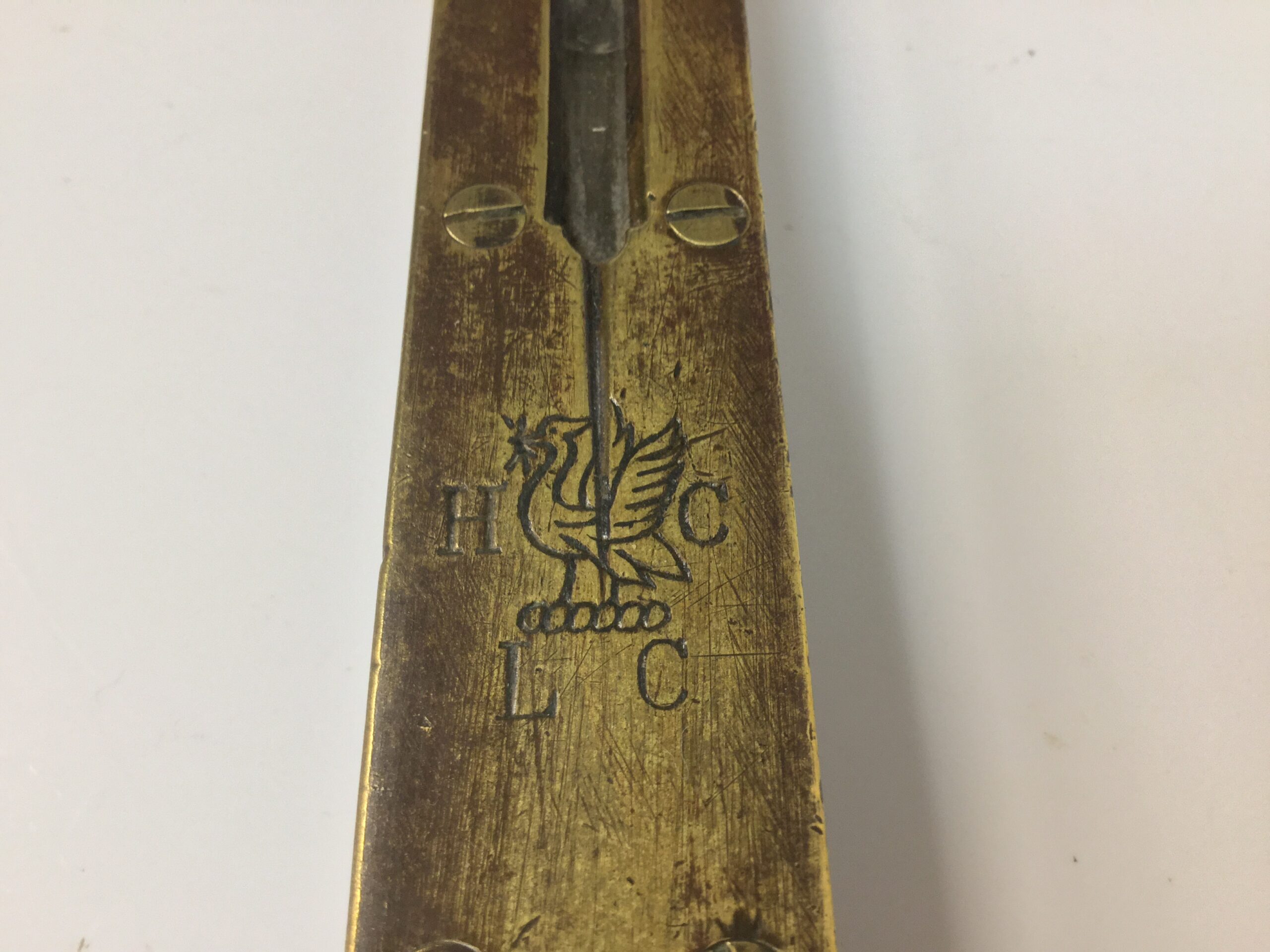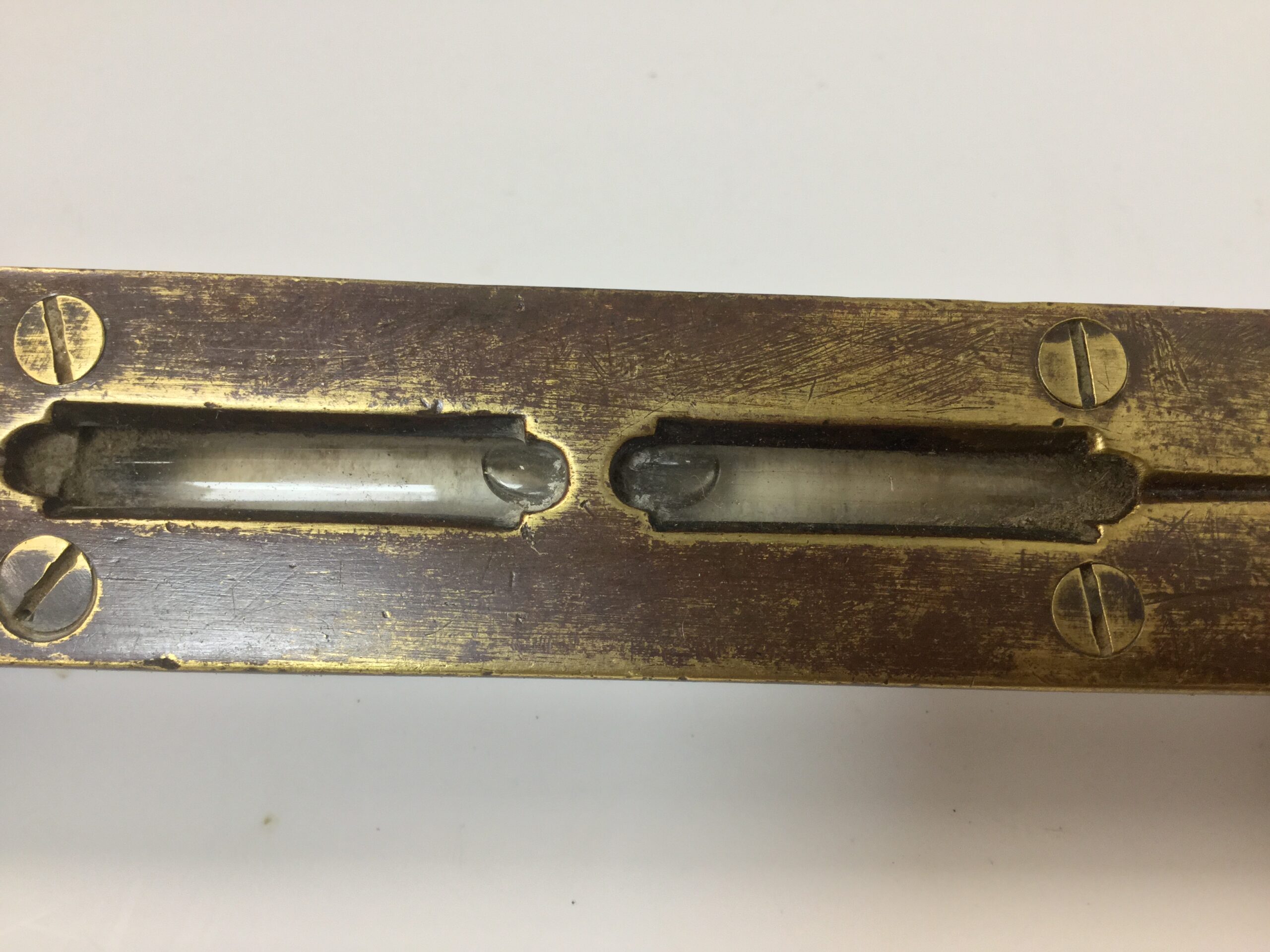 A very scarce 12” level with two LIverpool liverbirds stamped one either side of the vial, the bubble is working and neatly inscribed around each Liverbird are the initials HLCC, have been informed that the clerk of works the “Housing LIverpool City Council used this when checking off works for the housing department.it measures 12” long by 1 1/8” high by 1 3/16” width. The brass has discoloured with age adding to its charm, I dare say you will not come across another level with this Liverbird detail could be a one off.