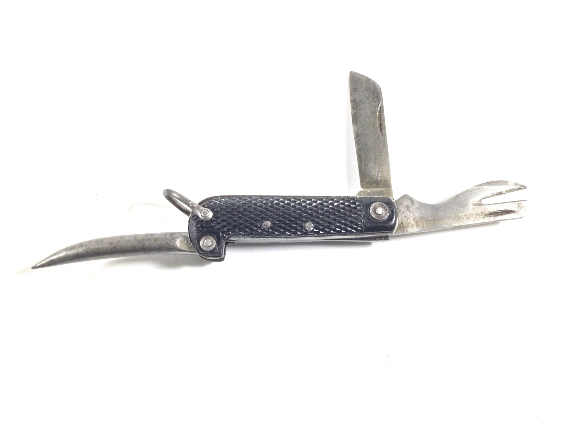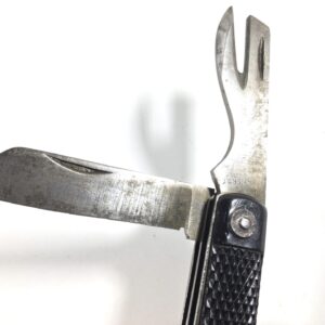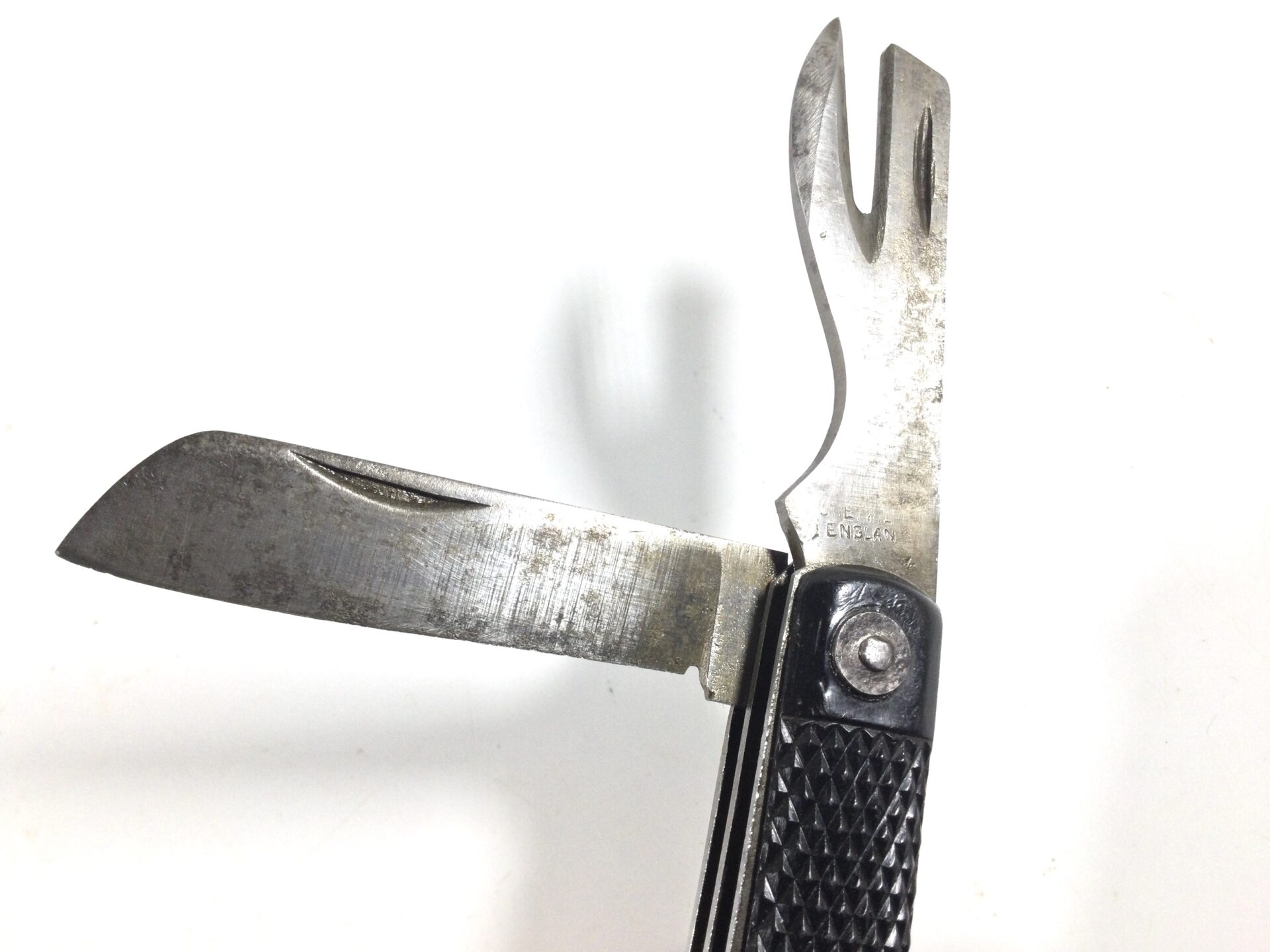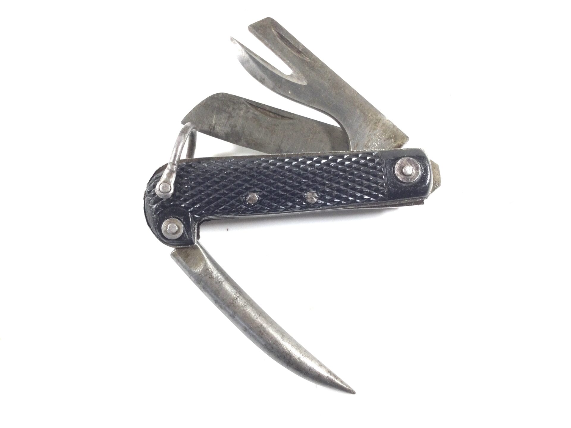 A vintage four tool clasp knife that has very strong spring action to all tools. Only marking I can see is “ENGLAND” holding a 2.3/8” knife, a tin opener, a spike and a flat end screwdriver. Fully closed measures 3.3/4”. Nice scaled handle.