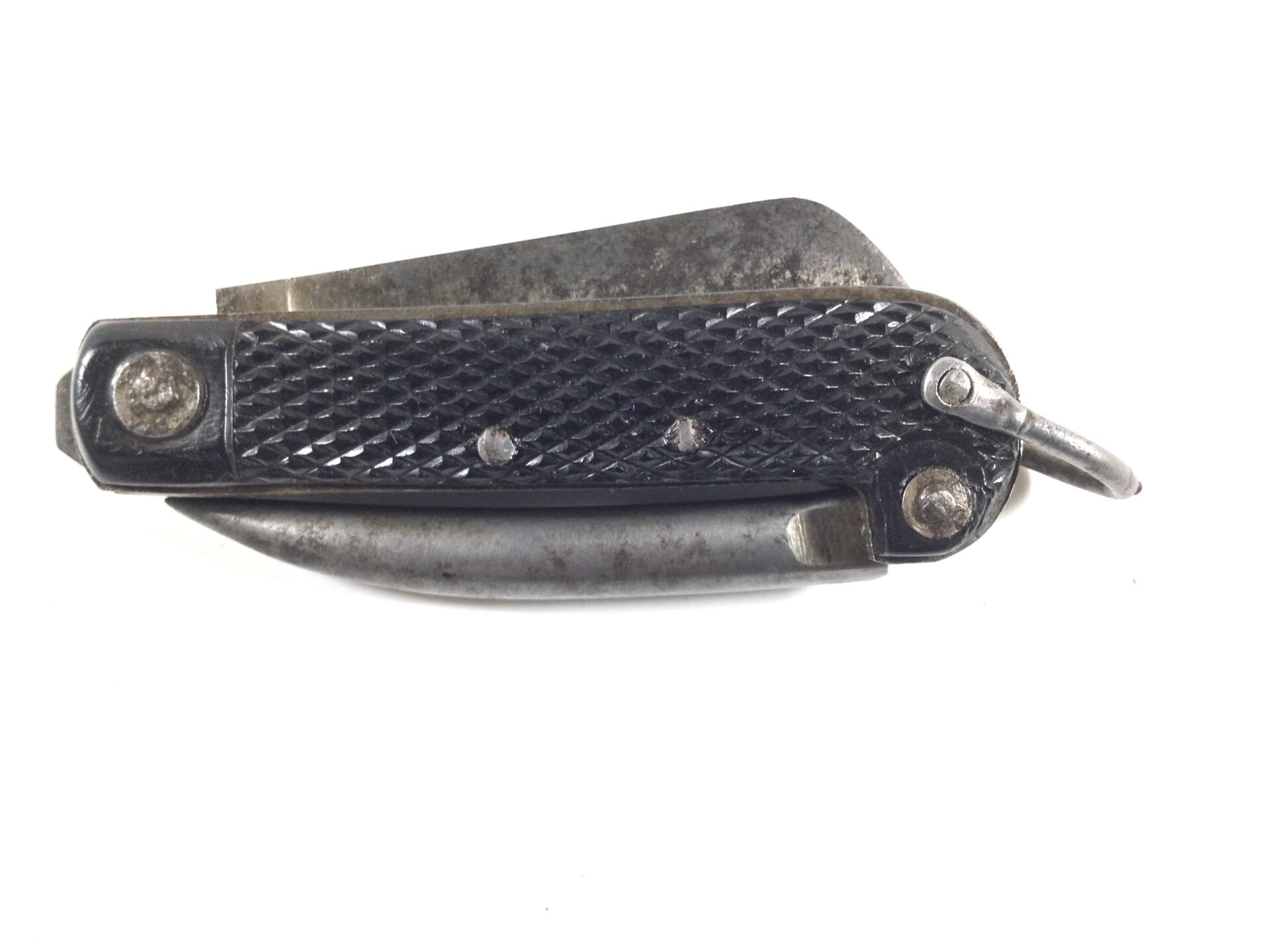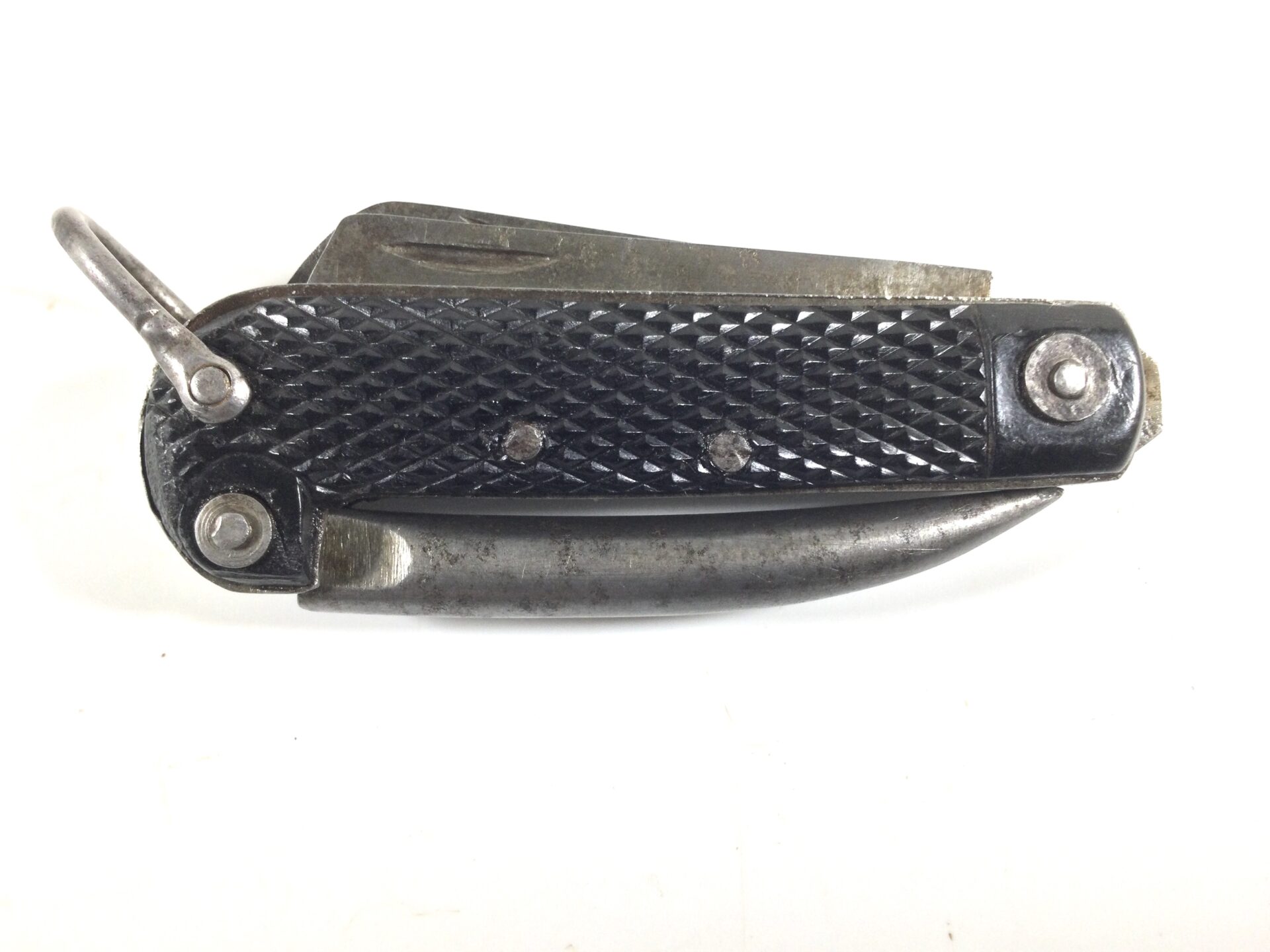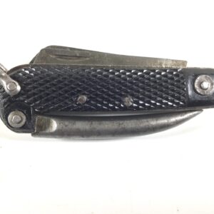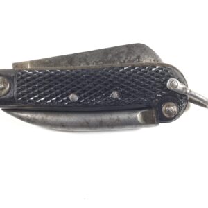 A vintage four tool clasp knife that has very strong spring action to all tools. Only marking I can see is “ENGLAND” holding a 2.3/8” knife, a tin opener, a spike and a flat end screwdriver. Fully closed measures 3.3/4”. Nice scaled handle.