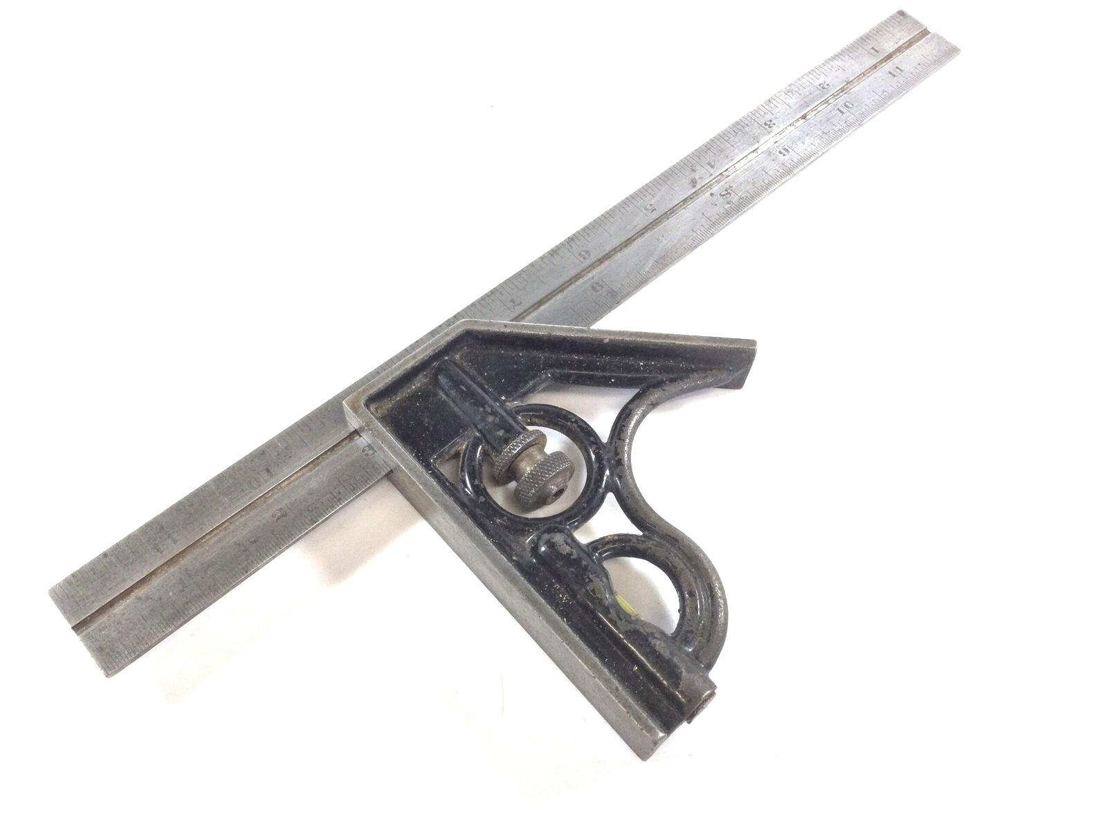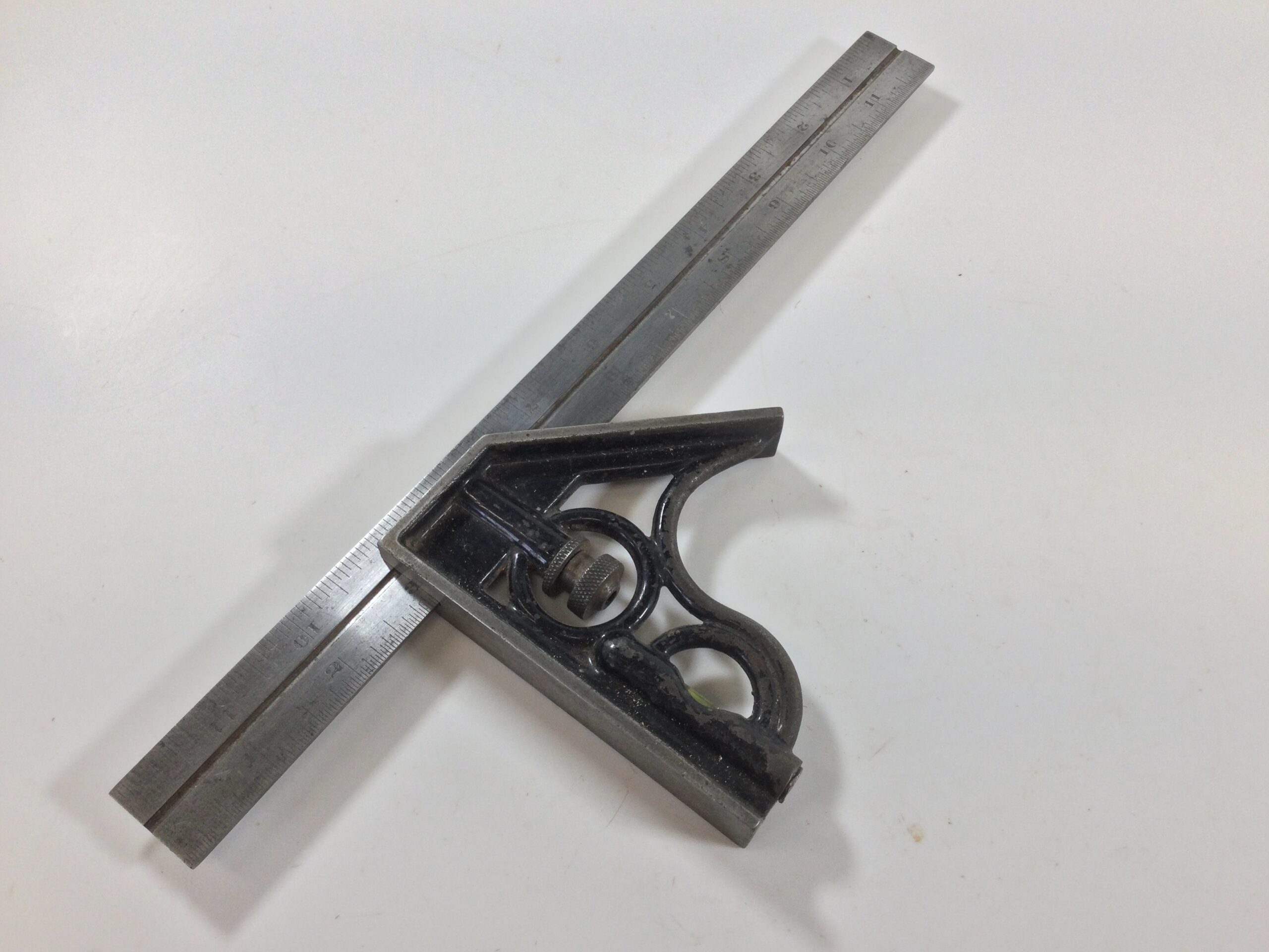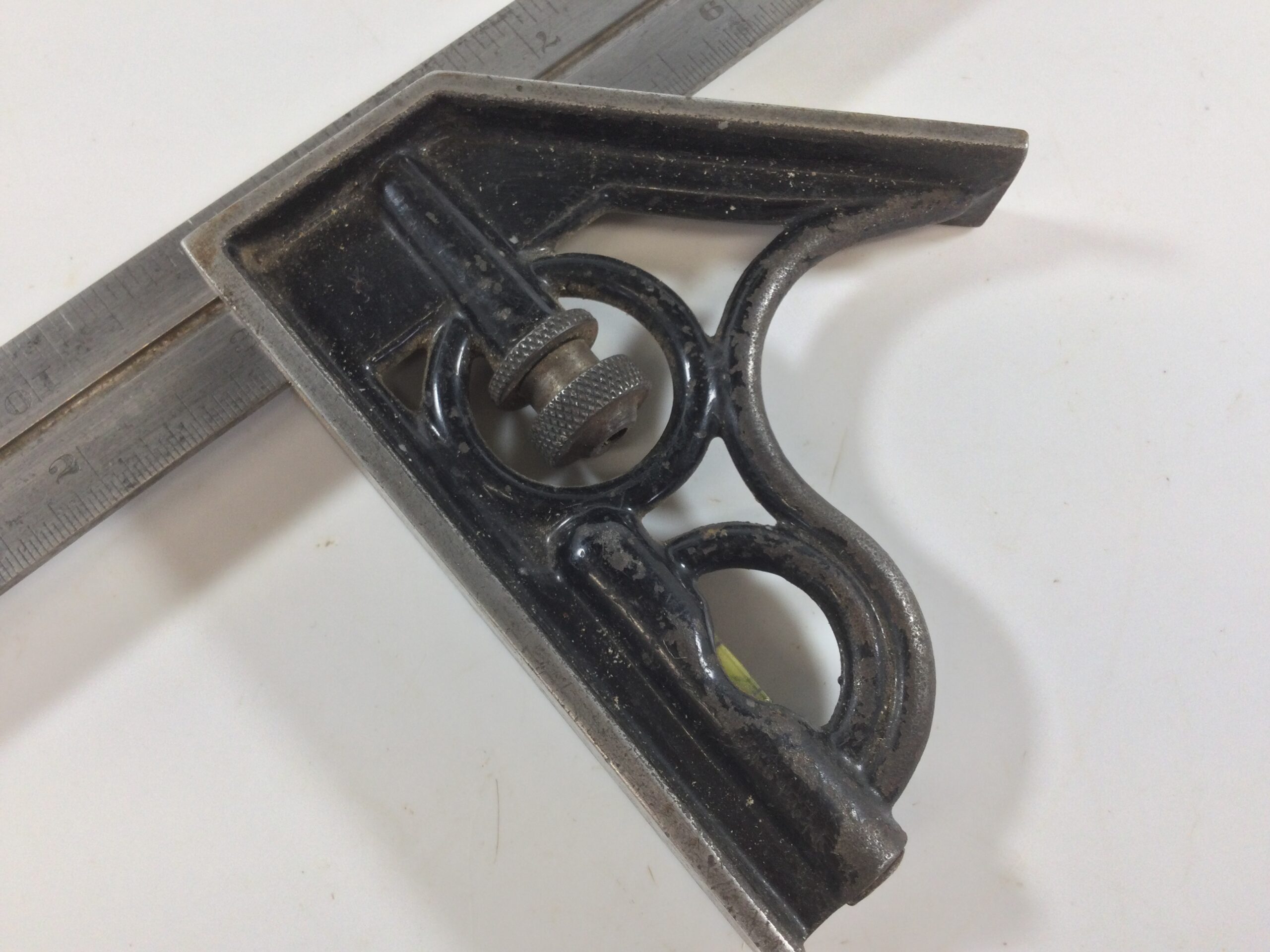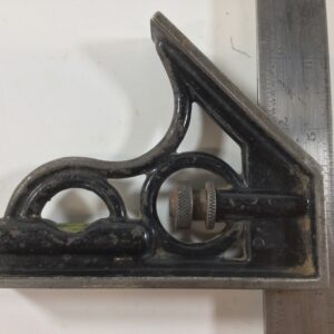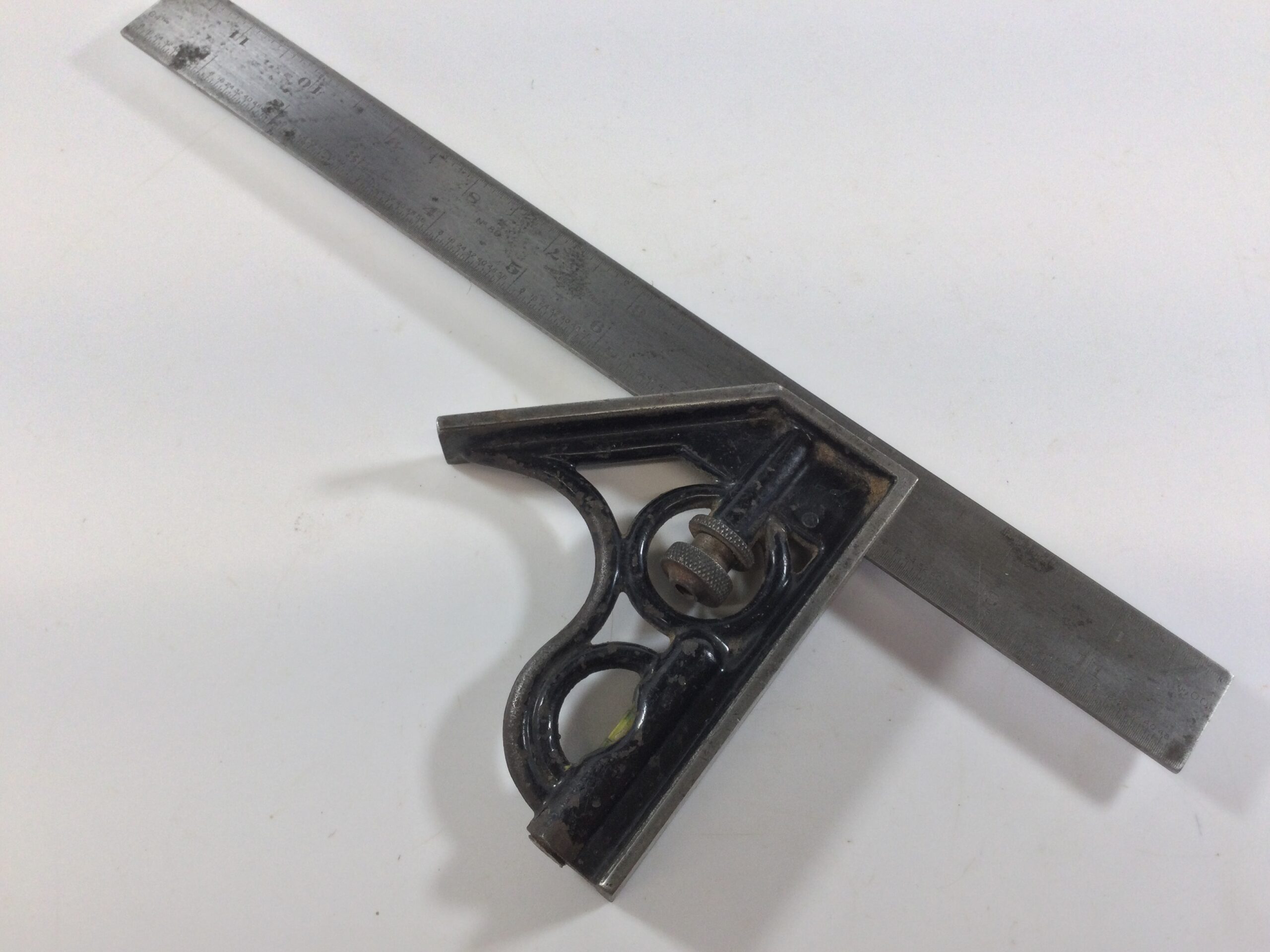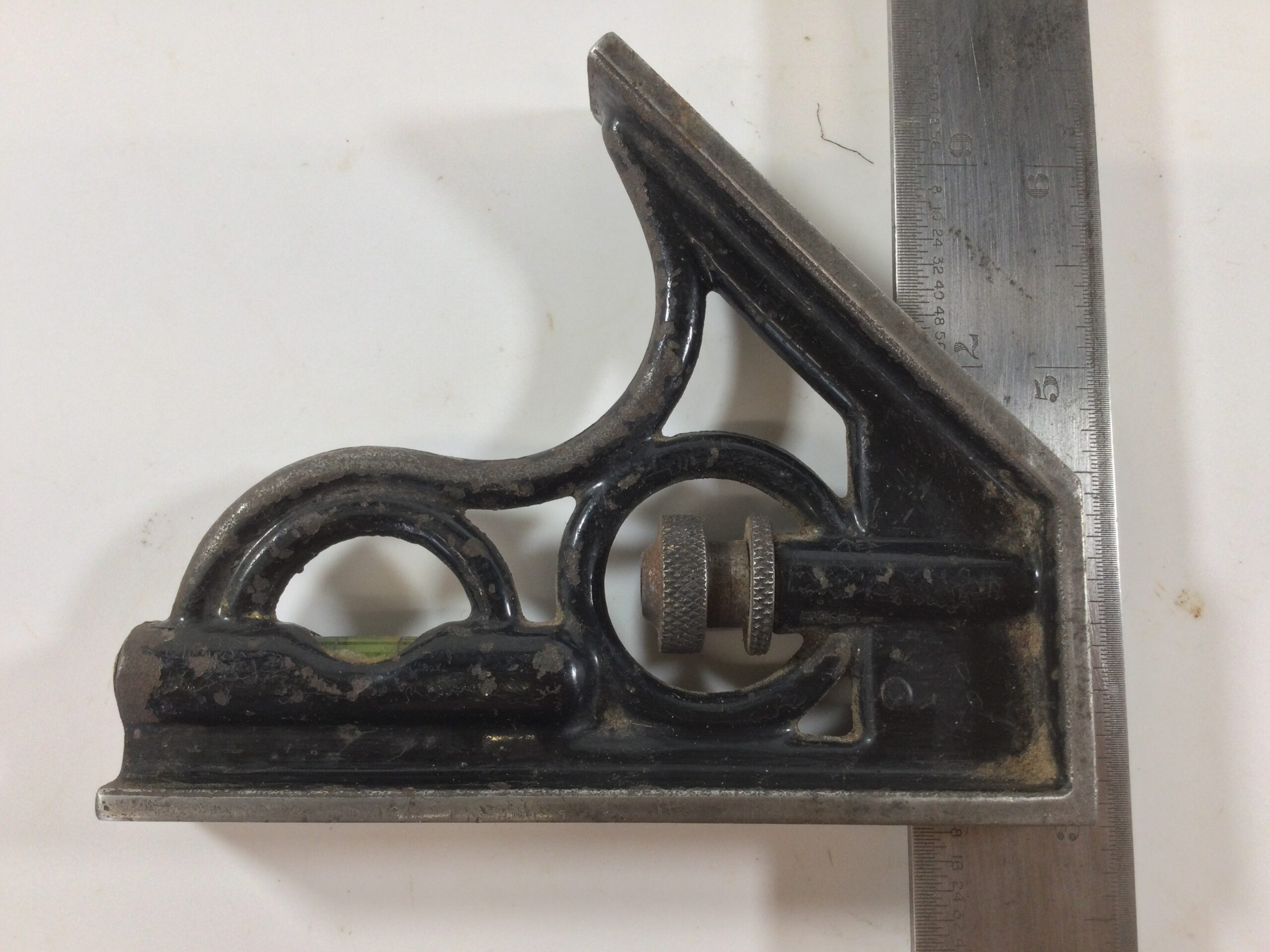 A nice Sheffield made 12” combination square, working bubble clean steel with minor discolouration spots. Imperial measurements. Missing its scribe pin, nice detail to the cast head.