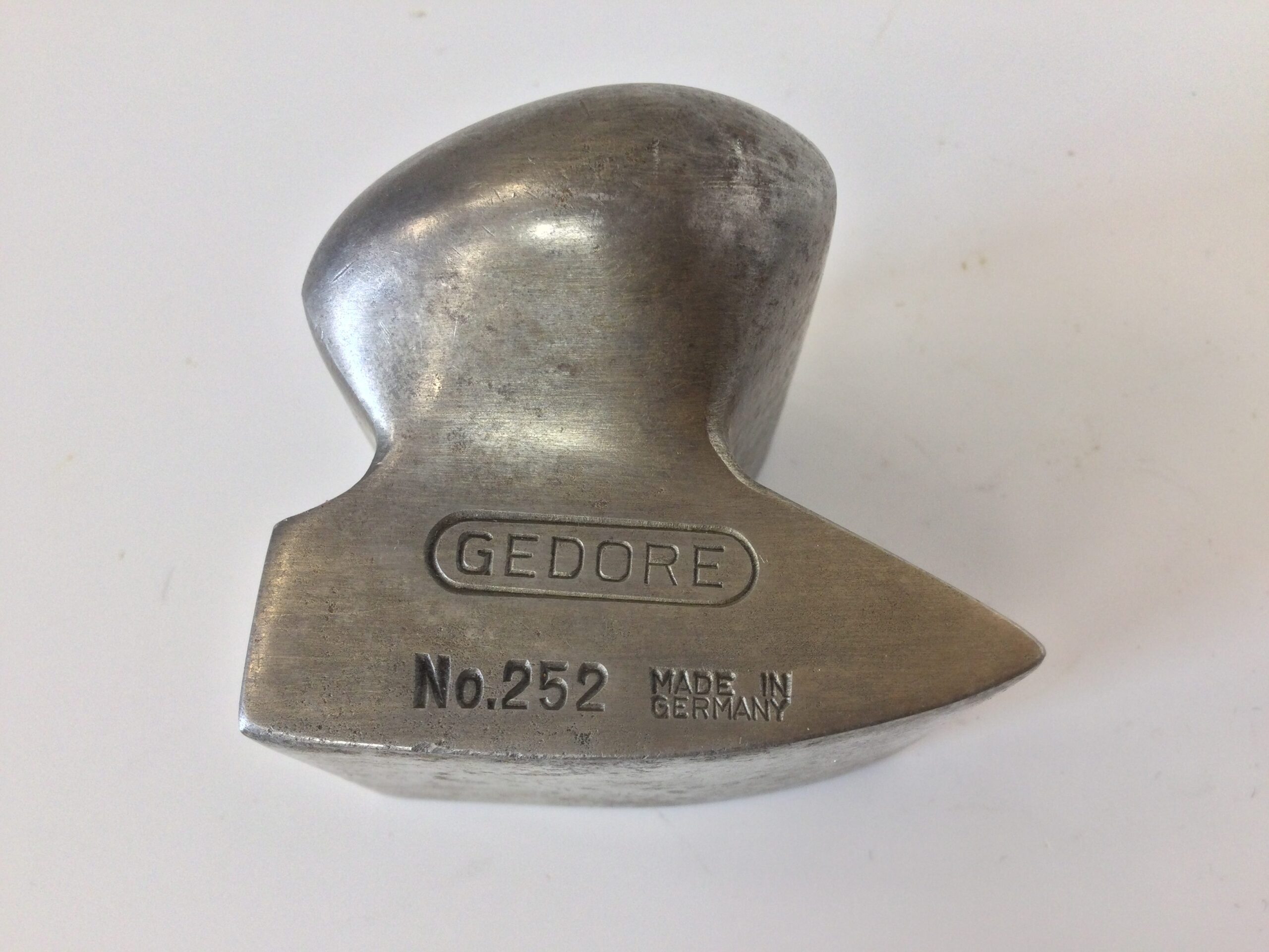 A nice clean steel anvil dolly, made in Germany by GEDORE, the lightly rounded bottom measures 62mm x 50mm.