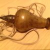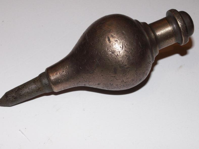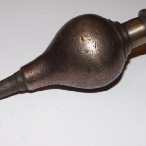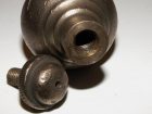 5 1/2″ long by 2″ diameter, top unscrews for line, plenty of dings nice age patina,
