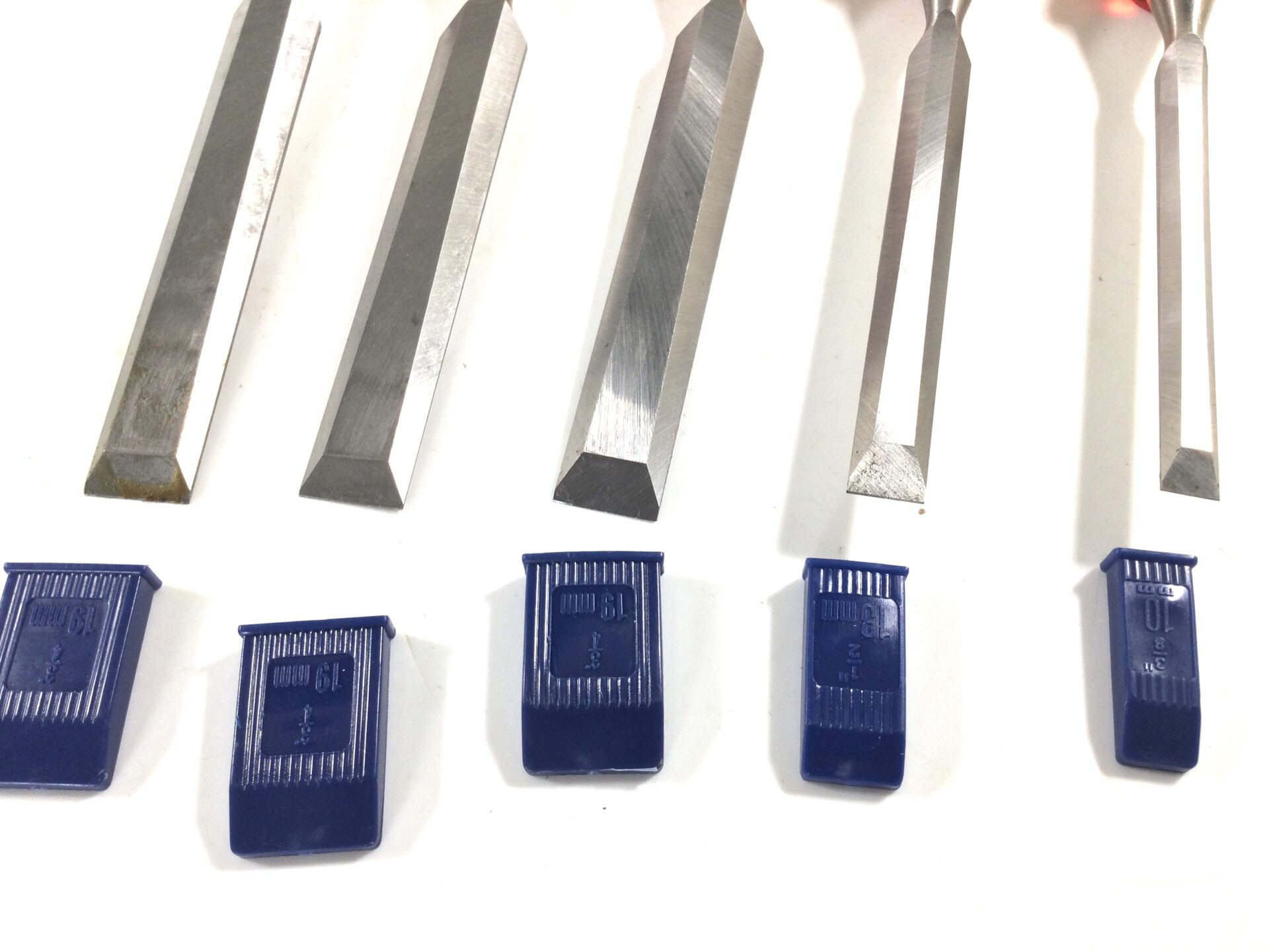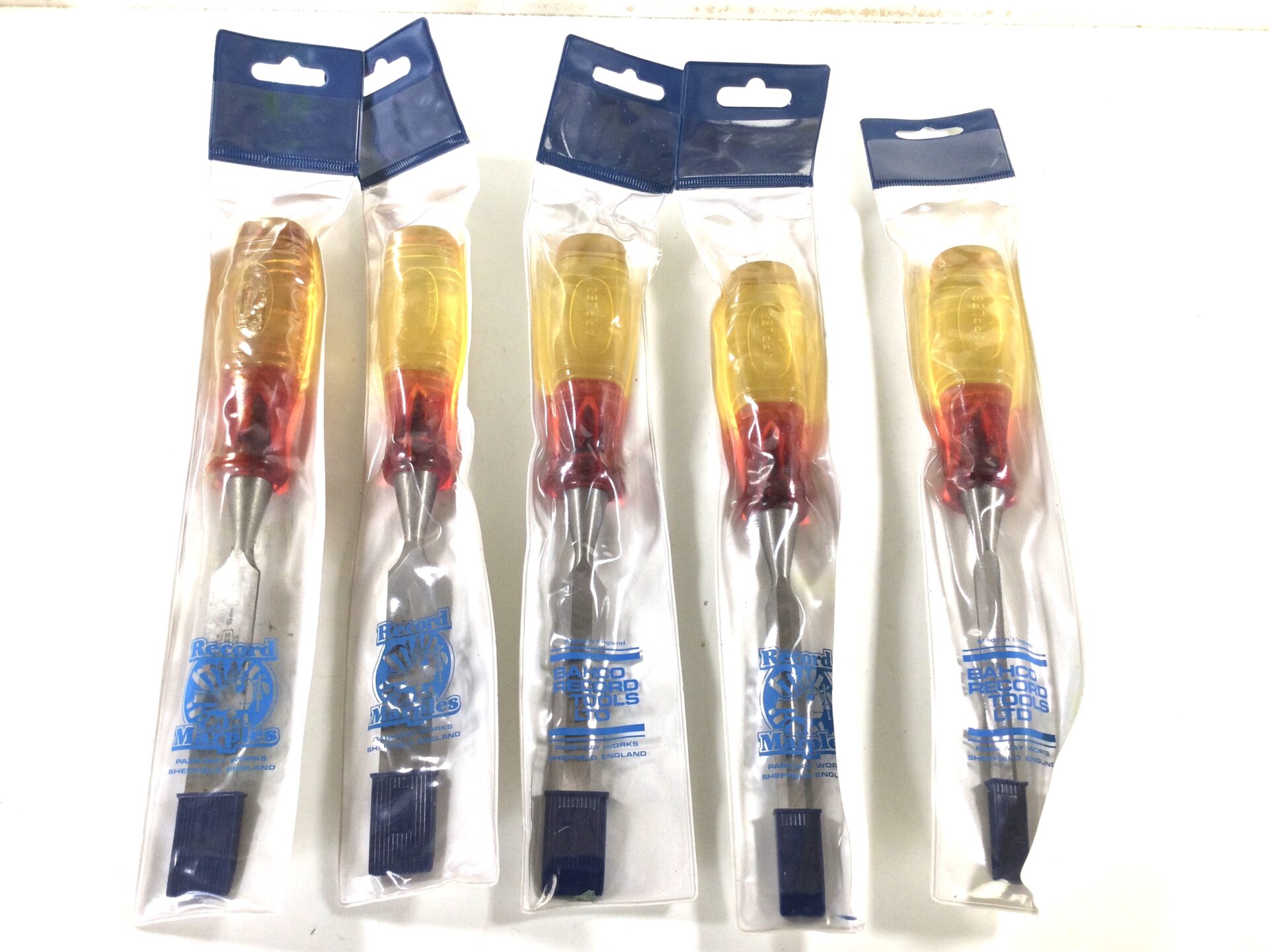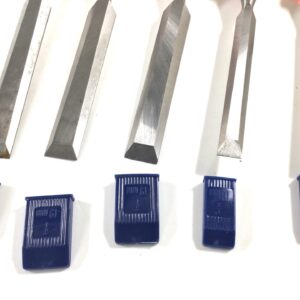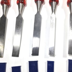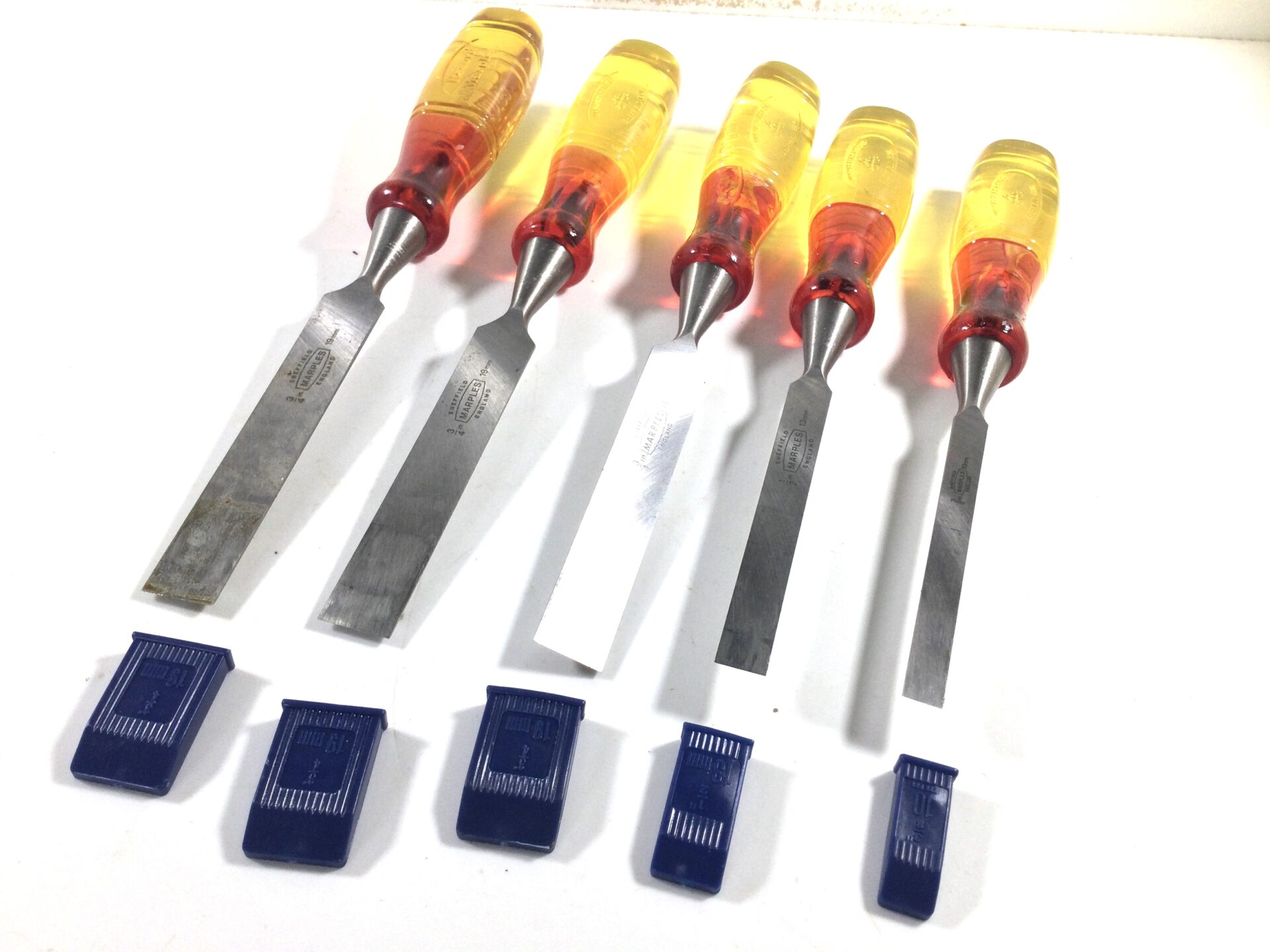 All five chisels have never been used, four of these have the early HIBERNIA logo clover leaf on the handles, they have been in their packaging for some time as some red residue is present in the packaging from the handles. There are 3 x 3/4” or 19mm 1 x 1/2” or 13mm and 1 x 3/8” or 10mm. All have original and correct edge protectors.