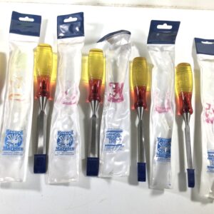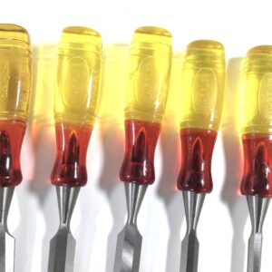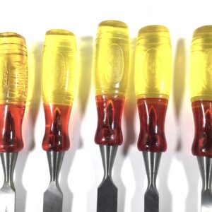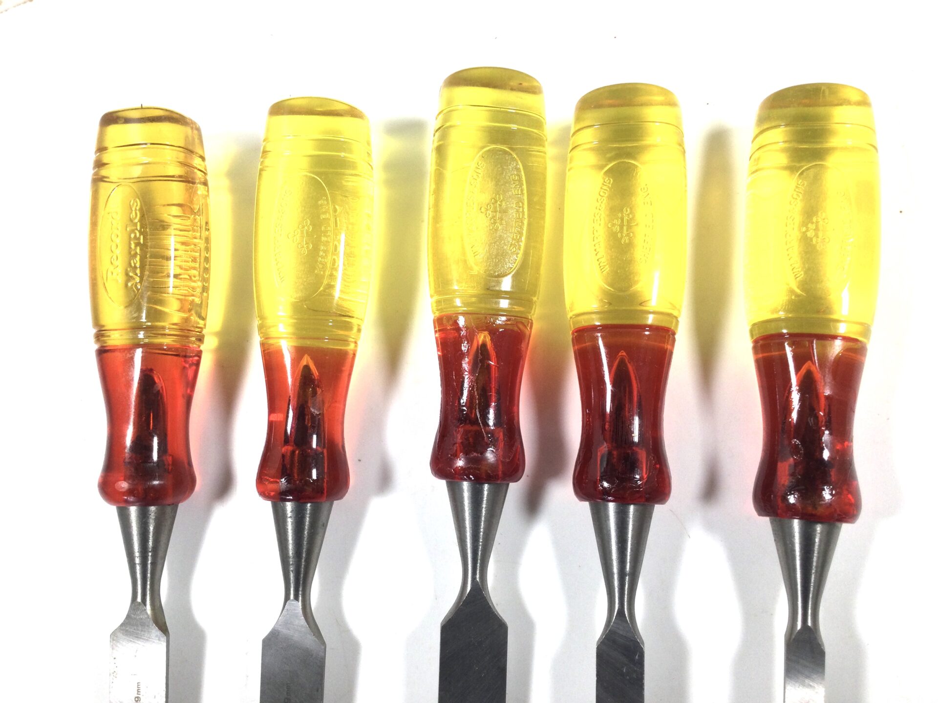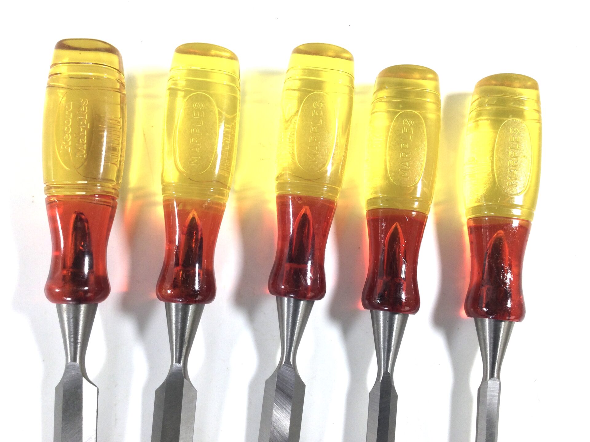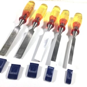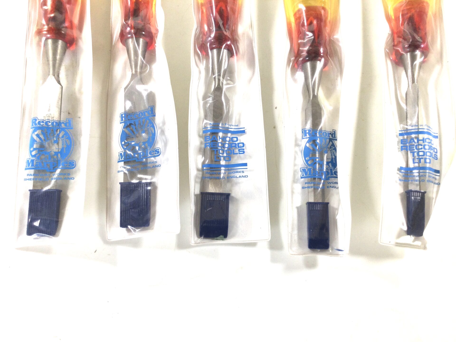 All five chisels have never been used, four of these have the early HIBERNIA logo clover leaf on the handles, they have been in their packaging for some time as some red residue is present in the packaging from the handles. There are 3 x 3/4” or 19mm 1 x 1/2” or 13mm and 1 x 3/8” or 10mm. All have original and correct edge protectors.