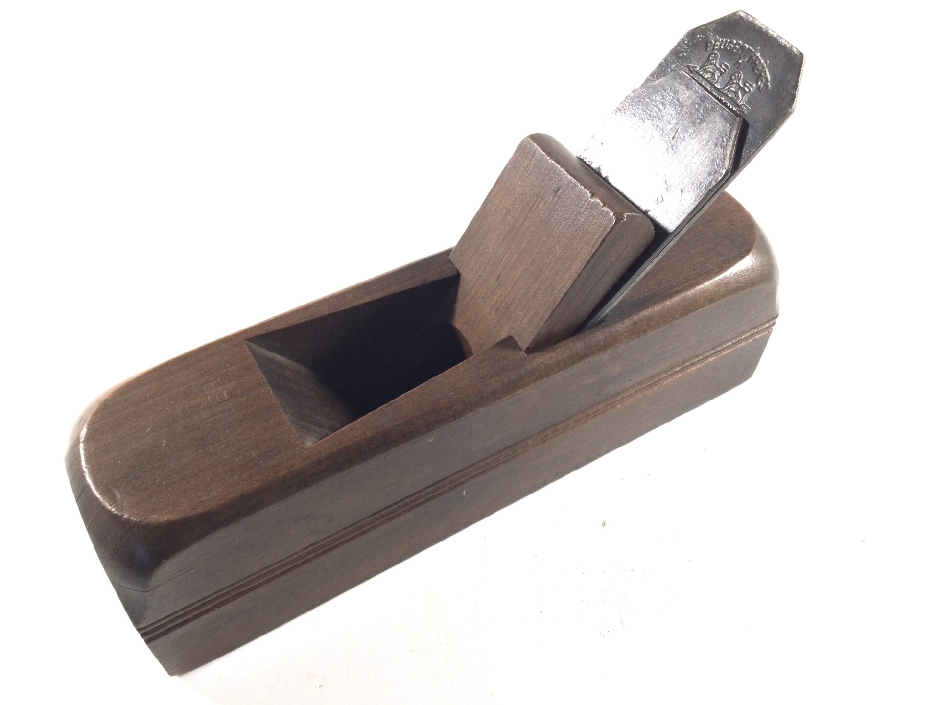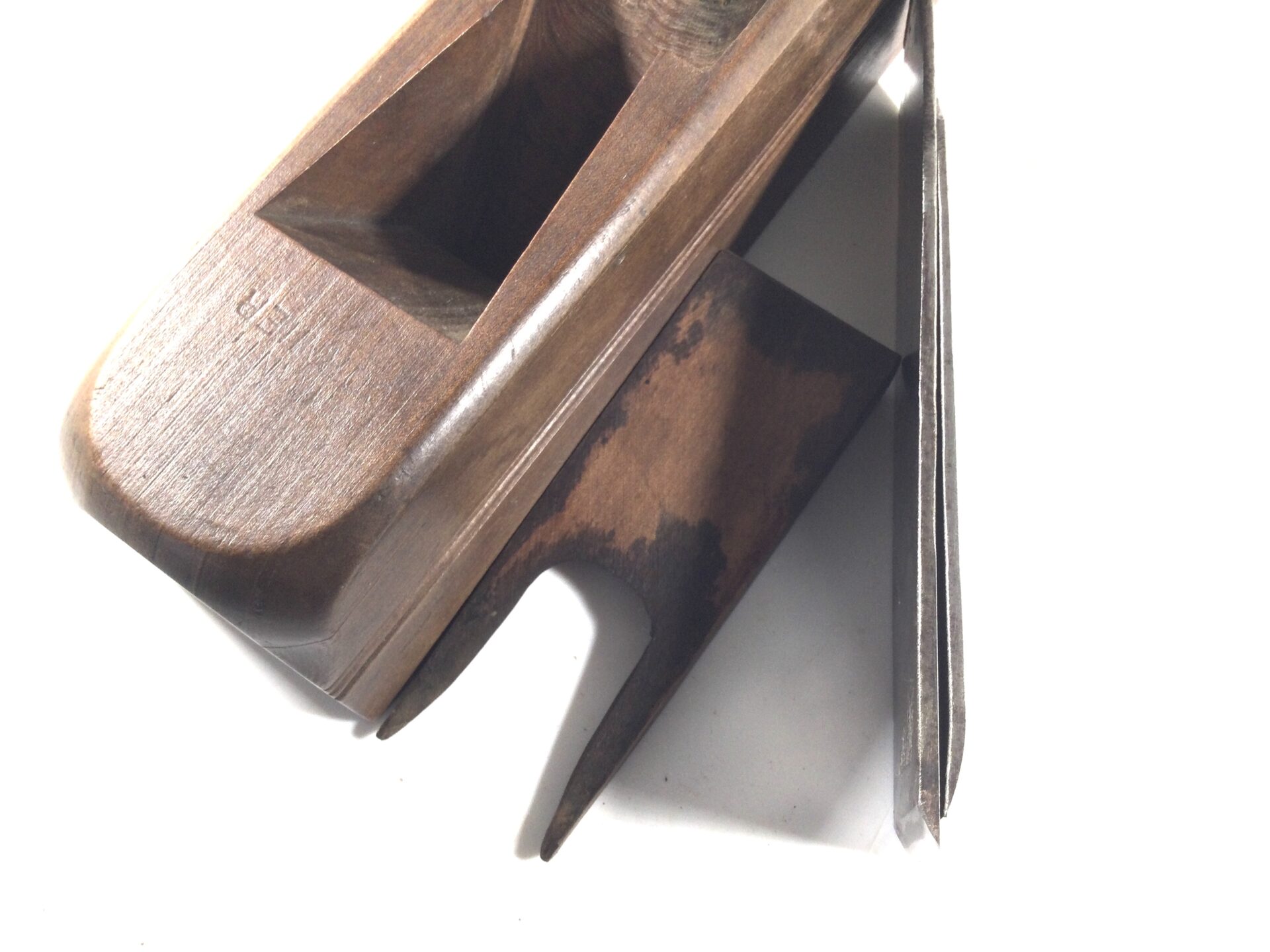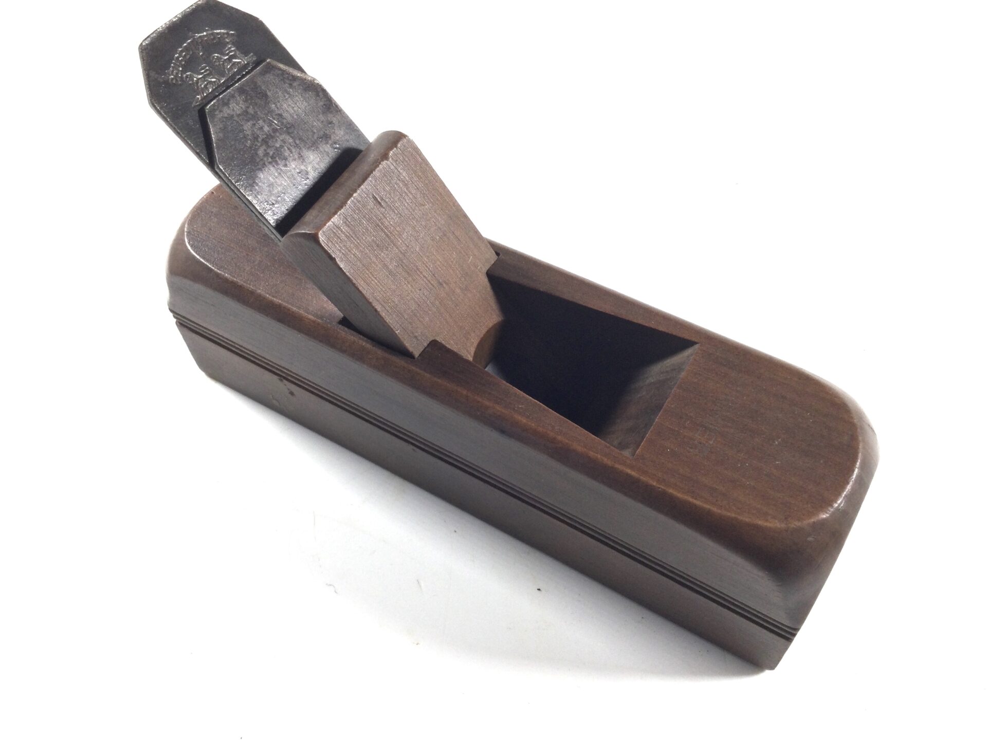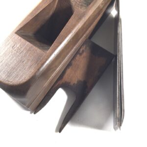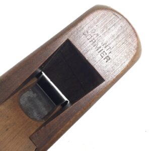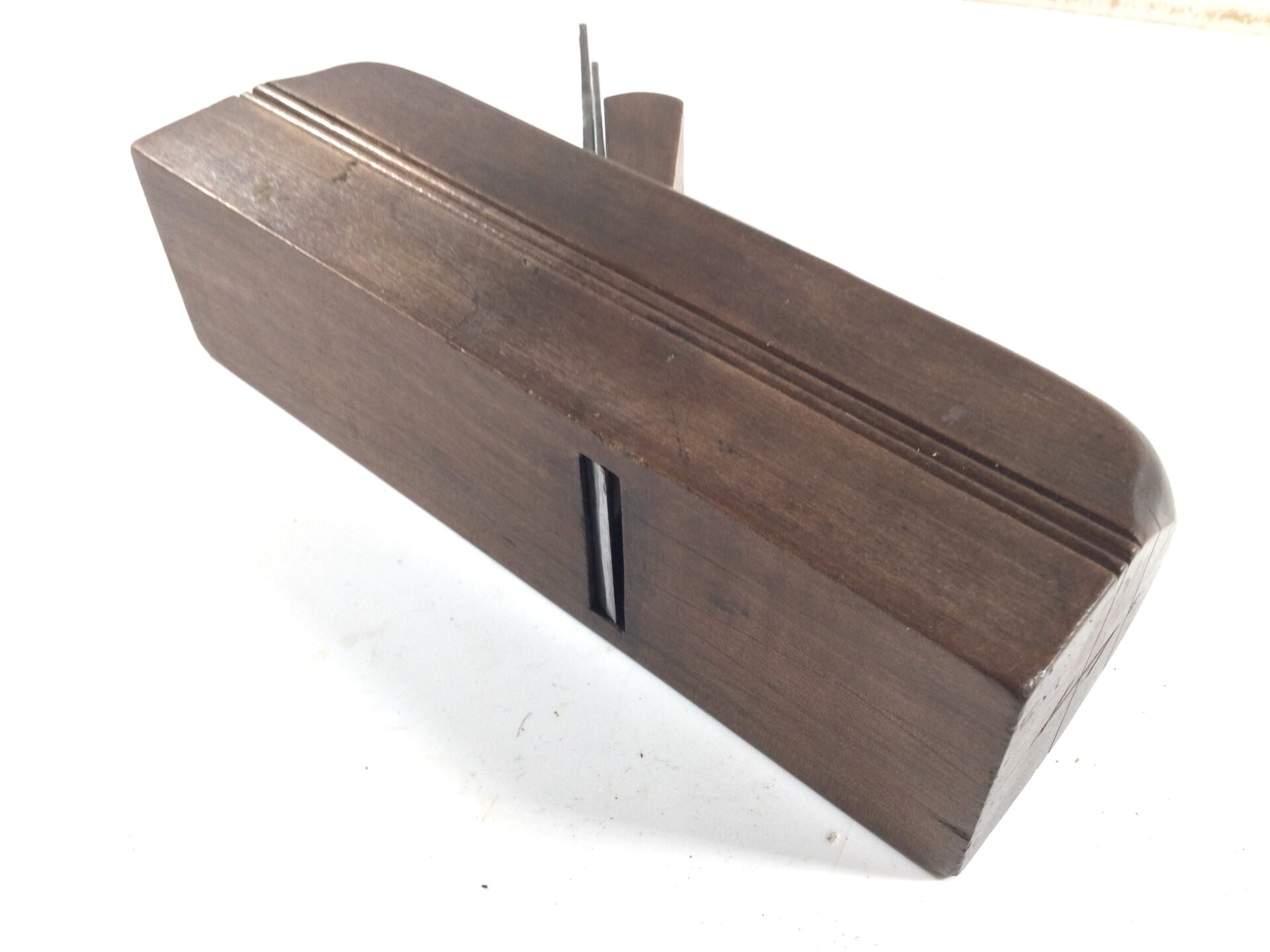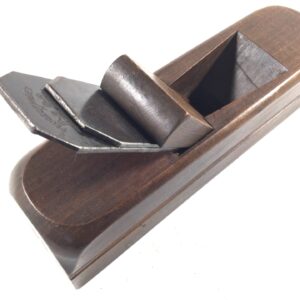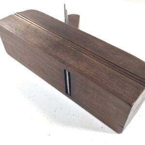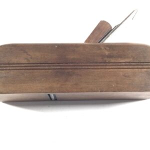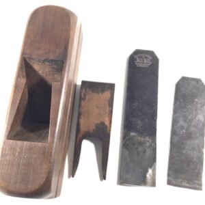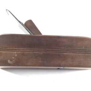 This is quite a heavy plane made in France from the Cormier tree. It is stamped on top “GARANTI CORMIER” the plane is made out of two pieces of wood with the joint being disguised in the middle of the double reed moulding around the plane, front nose stamped number #44 with the makers trademark. The 1.3/4” width iron stamped a PEUGEOT FRERES, with double lion logo. Cap iron is strange as it’s solid steel with no slot or screw it’s simply held by the wedge to lock the iron tight. A really nice and heavy wooden plane, belonged to a Luthier whom worked out of France and now returned back to the U.K. Plane measures 8.7/8” in length and in width measures 2.3/8”.