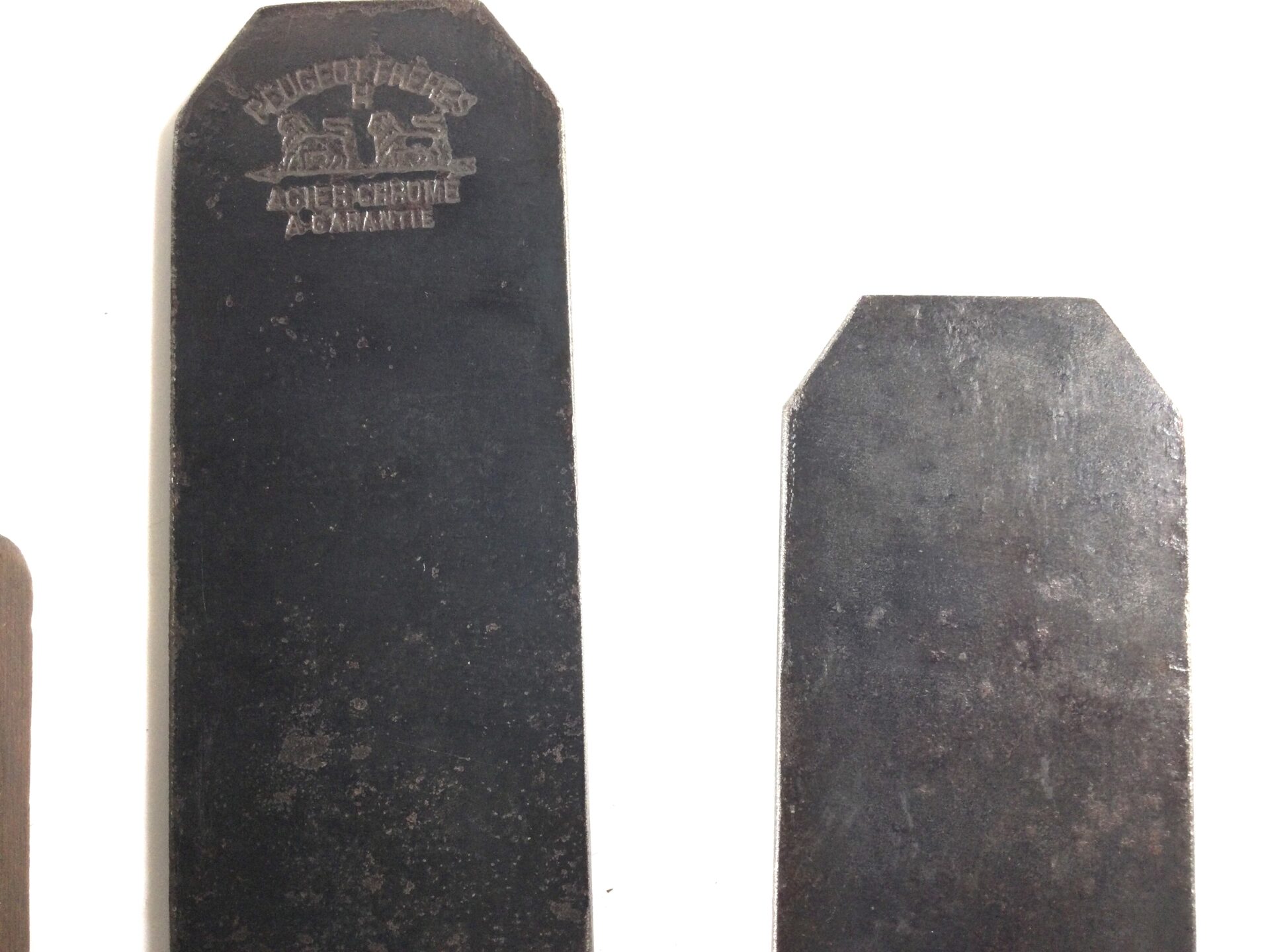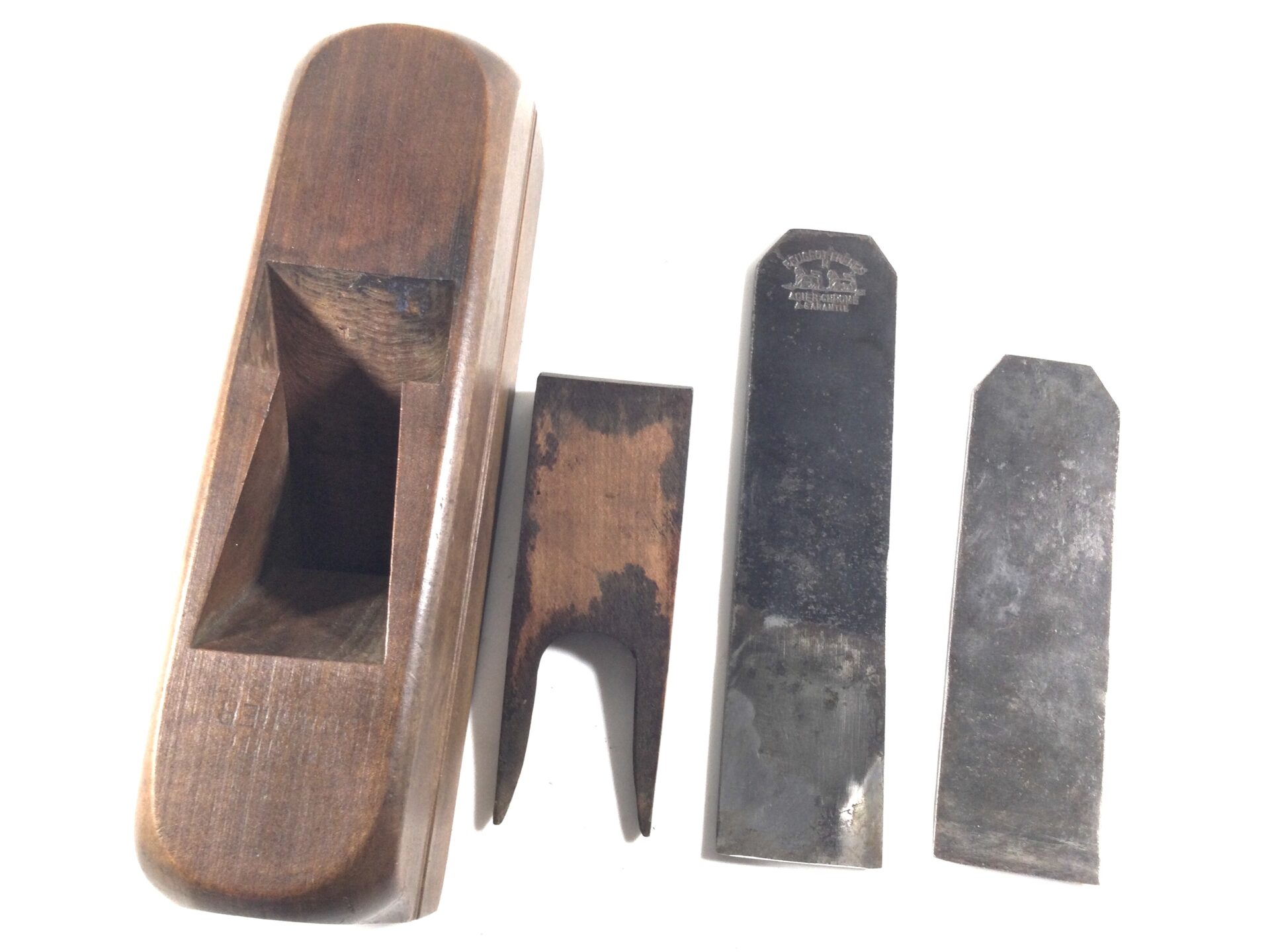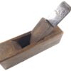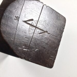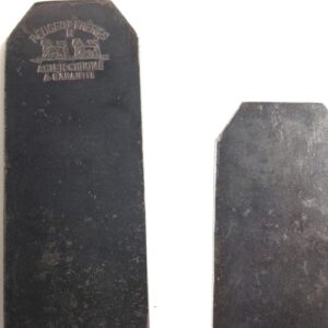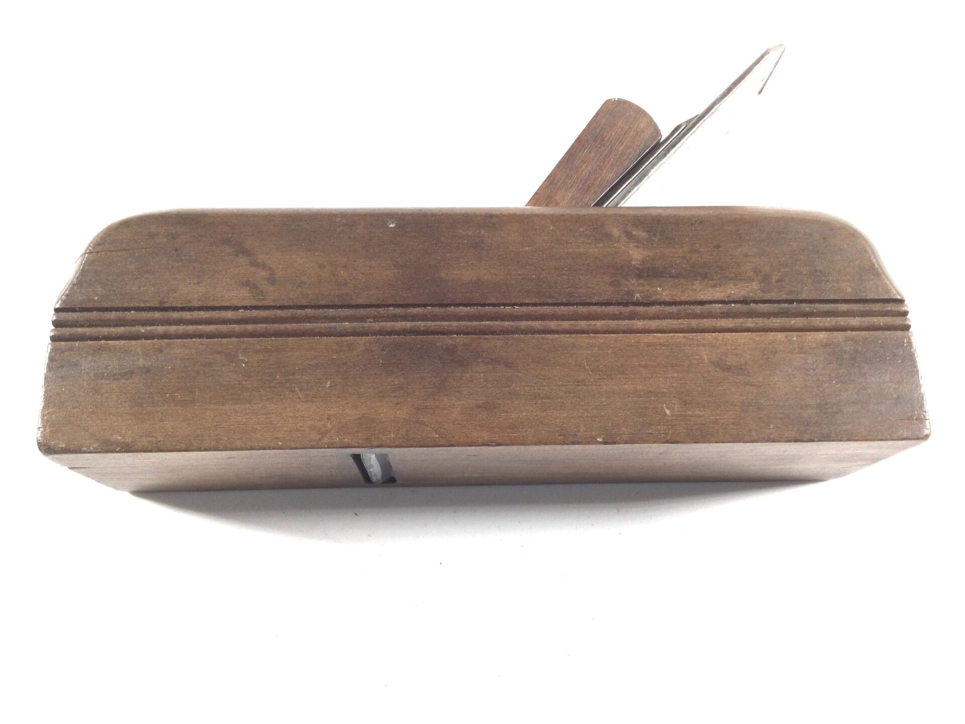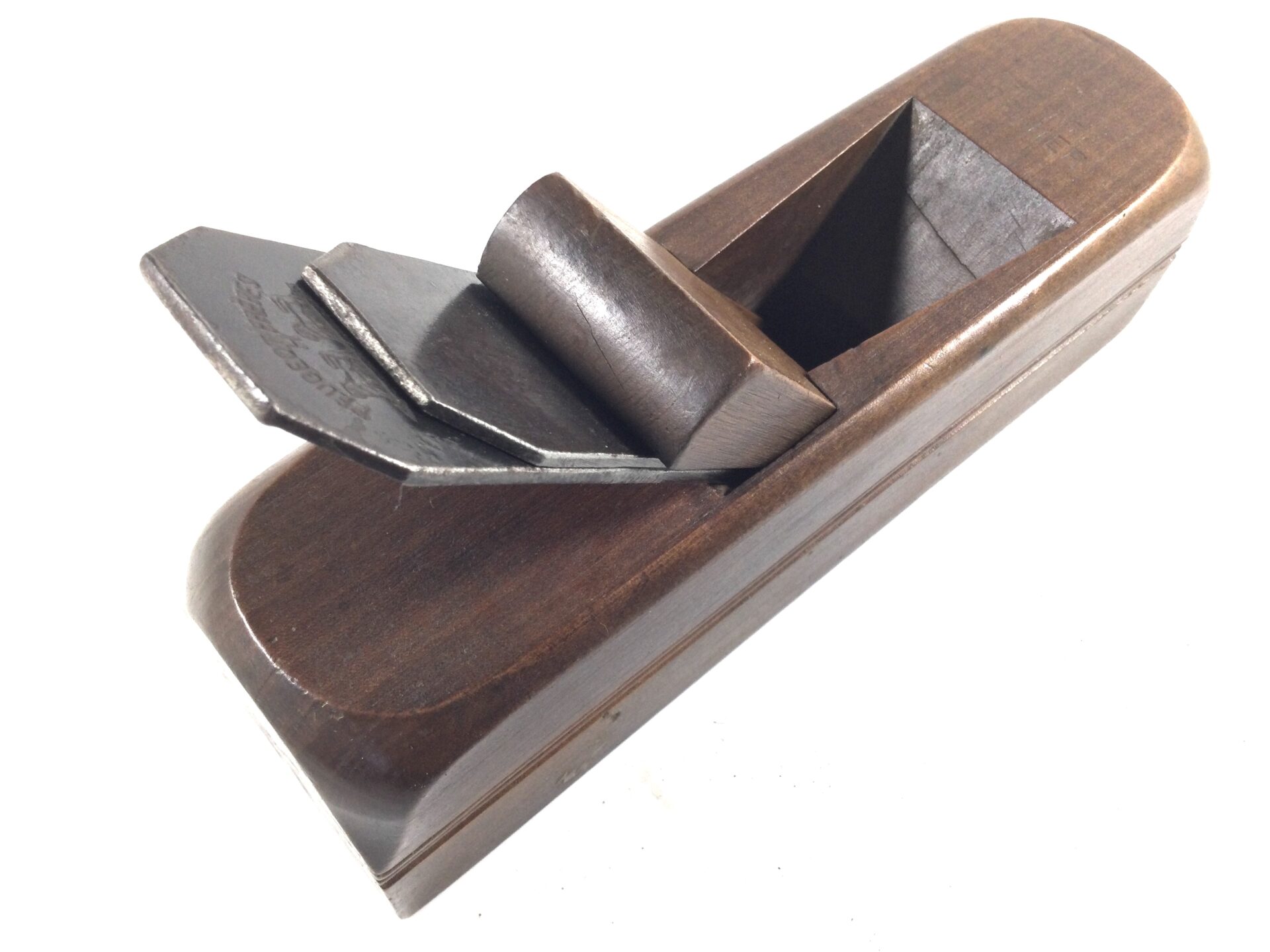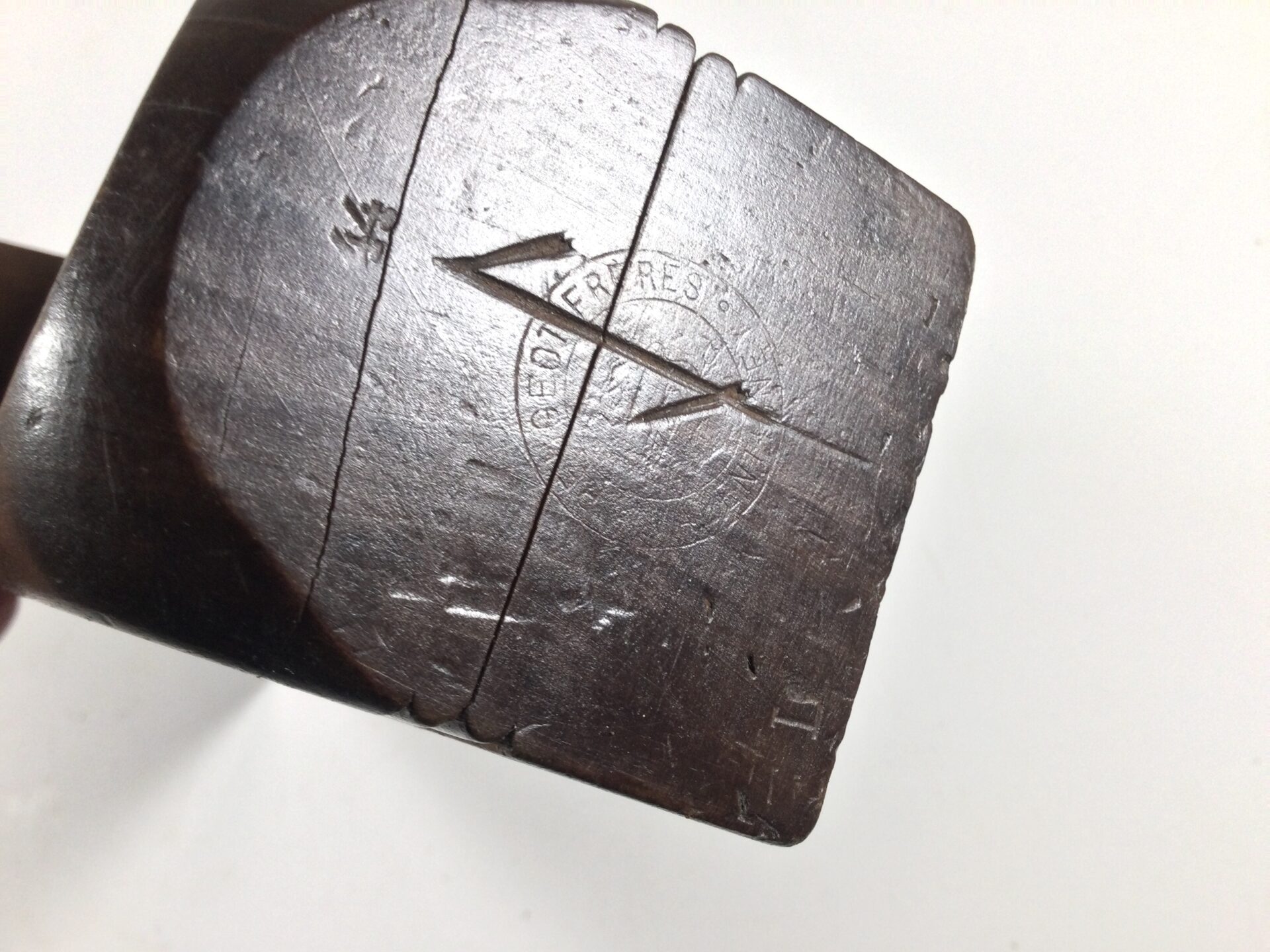 This is quite a heavy plane made in France from the Cormier tree. It is stamped on top “GARANTI CORMIER” the plane is made out of two pieces of wood with the joint being disguised in the middle of the double reed moulding around the plane, front nose stamped number #44 with the makers trademark. The 1.3/4” width iron stamped a PEUGEOT FRERES, with double lion logo. Cap iron is strange as it’s solid steel with no slot or screw it’s simply held by the wedge to lock the iron tight. A really nice and heavy wooden plane, belonged to a Luthier whom worked out of France and now returned back to the U.K. Plane measures 8.7/8” in length and in width measures 2.3/8”.